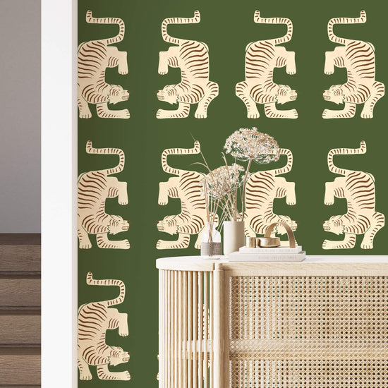 Die selbstklebende grune tiger tapete besteht aus robustem, dickem Vinyl mit Leinwandstruktur. Sie ist selbstklebend und lässt sich leicht anbringen und entfernen, was sie ideal für Mietobjekte macht.
