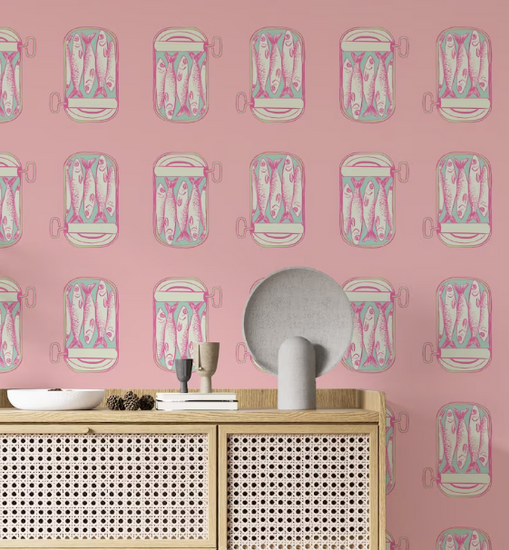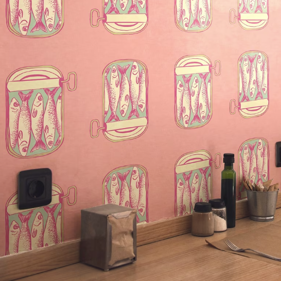 Funky sardines wallpaper is made of durable, thick vinyl with a canvas structure. It is self-adhesive and easy to apply and remove, making it great for rental spaces.