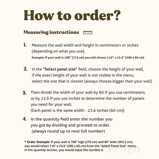 - In the quantity menu, enter the number you obtained by dividing and then proceed with the order. (If you get a number with decimals, always round up to the next whole number). Tip: It is recommended to order a bit more than the wall size just in case (for cutting and waste). Order Example: If you have a wall 108" high (270 cm) and 80" long (203.2 cm), this is what your order would look like: In the "Choose the size of the panel" menu, you would select 110" x 23.6"/280 x 60 cm and enter the number 4 in the quantity menu.