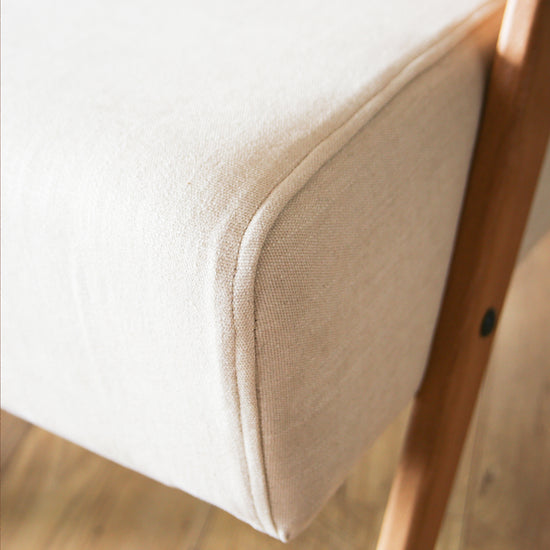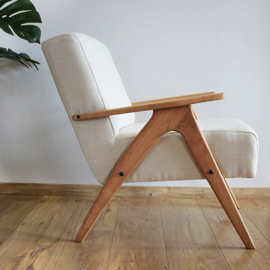 Les accoudoirs sont en bois de hêtre massif et teints de la couleur de votre choix. Le siège, ergonomiquement ajusté, est garni d'une mousse d'ameublement mi-ferme avec une densité de 35 kg/m3, garantissant ainsi une qualité et une durabilité optimales.